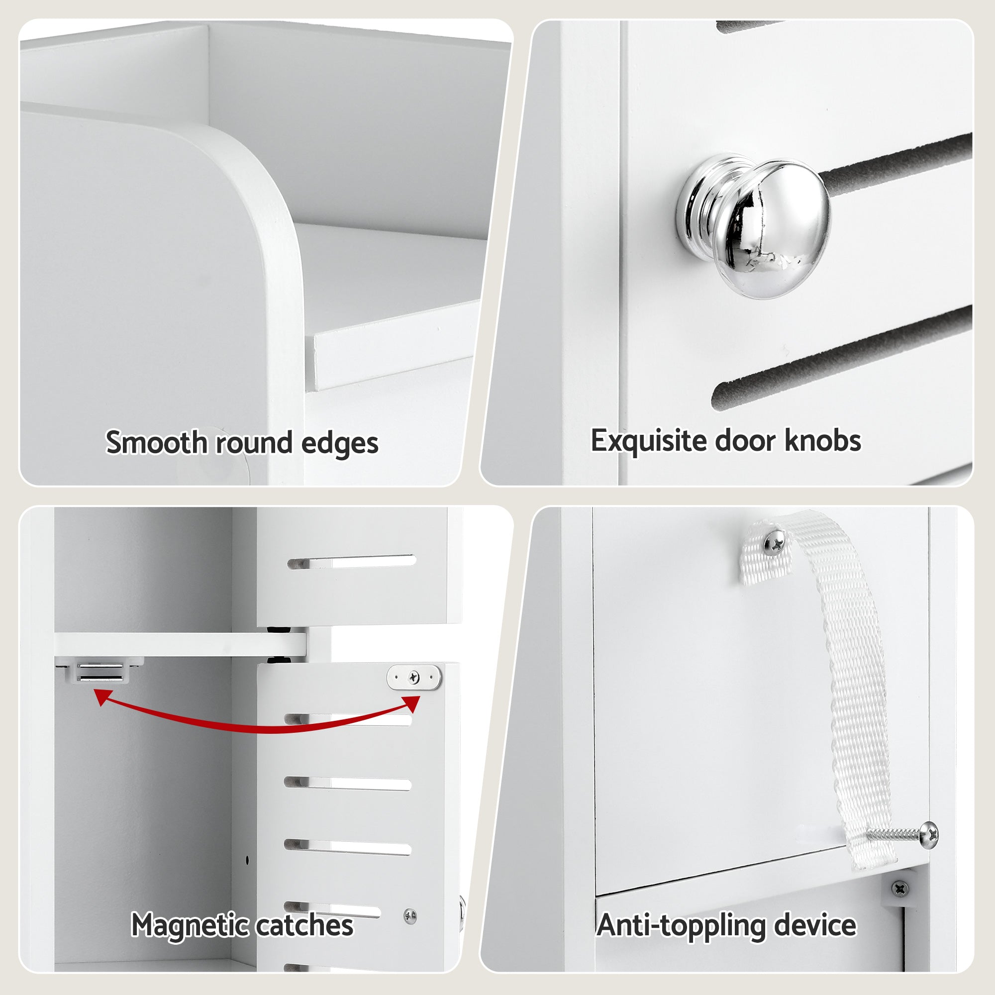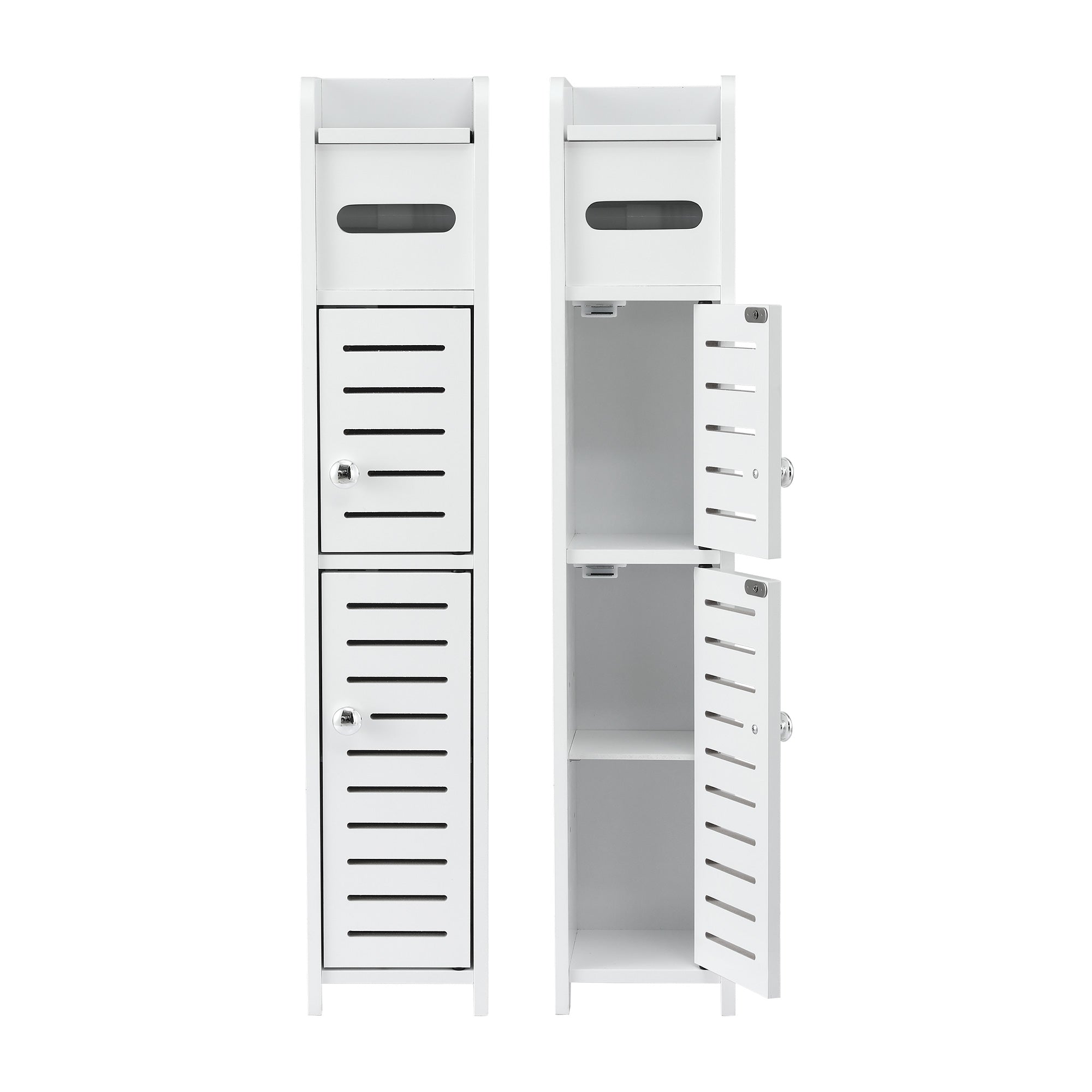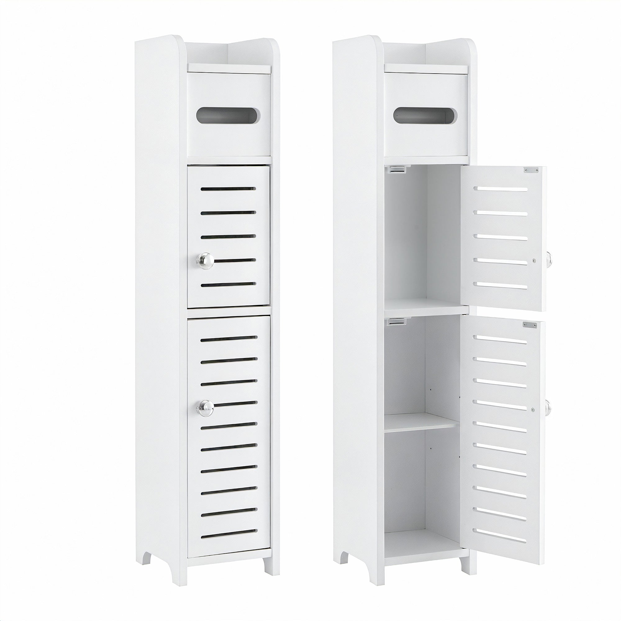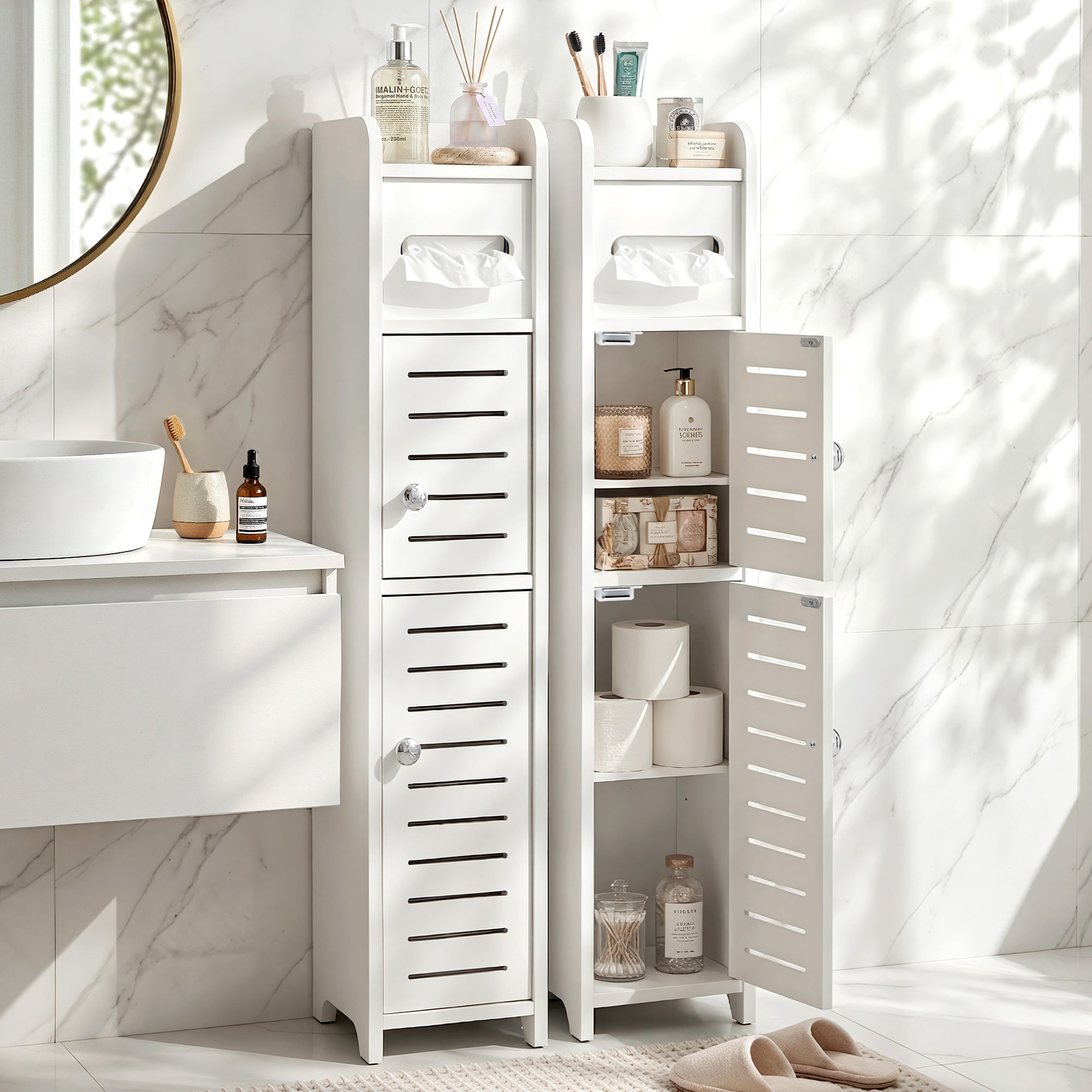 This Narrow Storage Unit features a customisable adjustable shelf and an integrated toilet roll cabinet for daily convenience. The elegant louver door design ensures ventilation, while the sturdy Free Standing Floor Cabinet build includes an anti-tip kit for family safety. It's the ideal Bathroom Organizer that combines durability with a sleek, easy-to-clean finish.