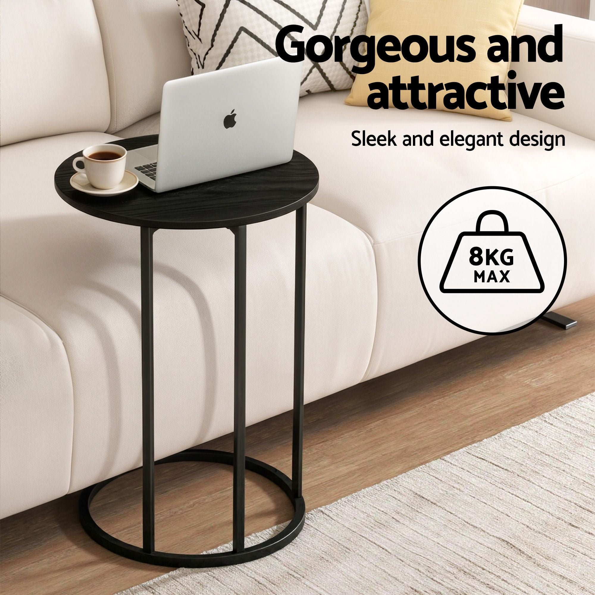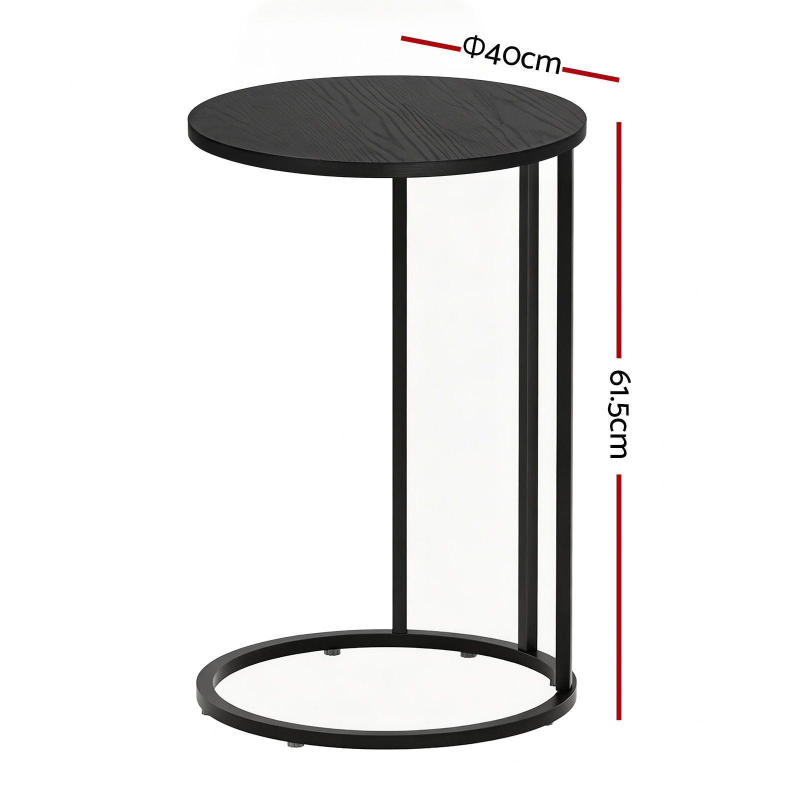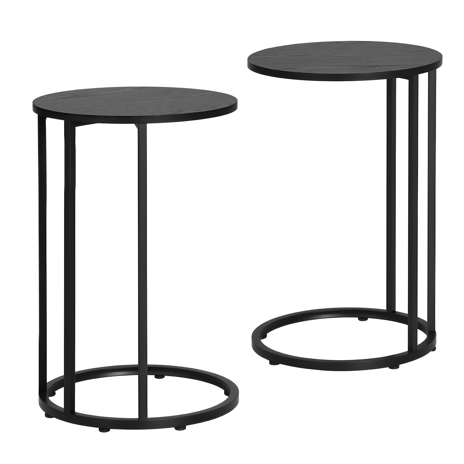 Enhance your home with this Artiss functional C-Shaped End Table Set of 2. Designed for convenience, these tables slide perfectly under furniture to save space in small apartments. Each table measures 40cm (W) x 61.5cm (H) and features a durable black wood-textured top on a sturdy powder-coated metal frame. Supporting up to 8kg, they are ideal as sofa side tables, laptop stands, or bedside nightstands. Their sleek, round design adds a modern touch to any living room or bedroom. Easy to assemble and move.
