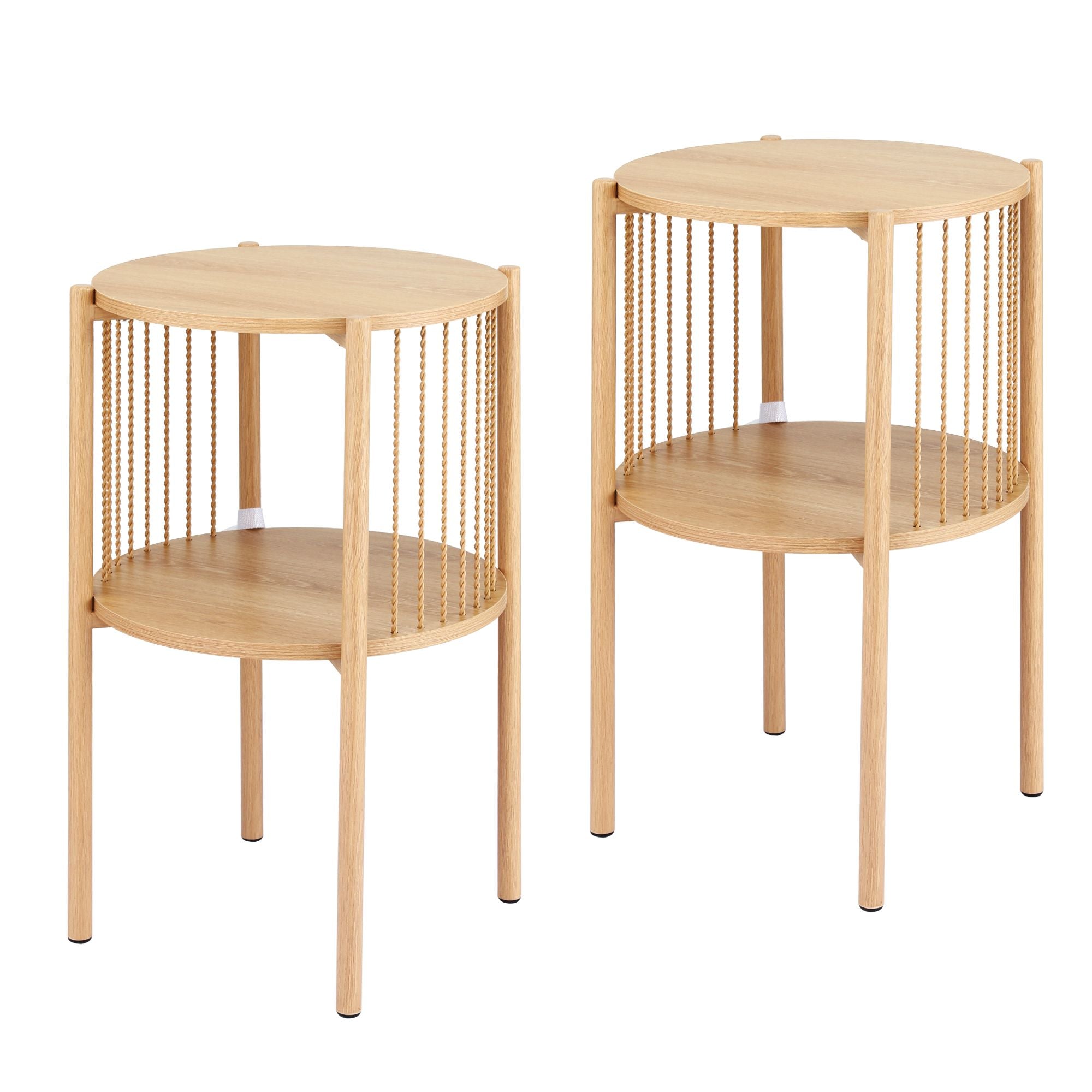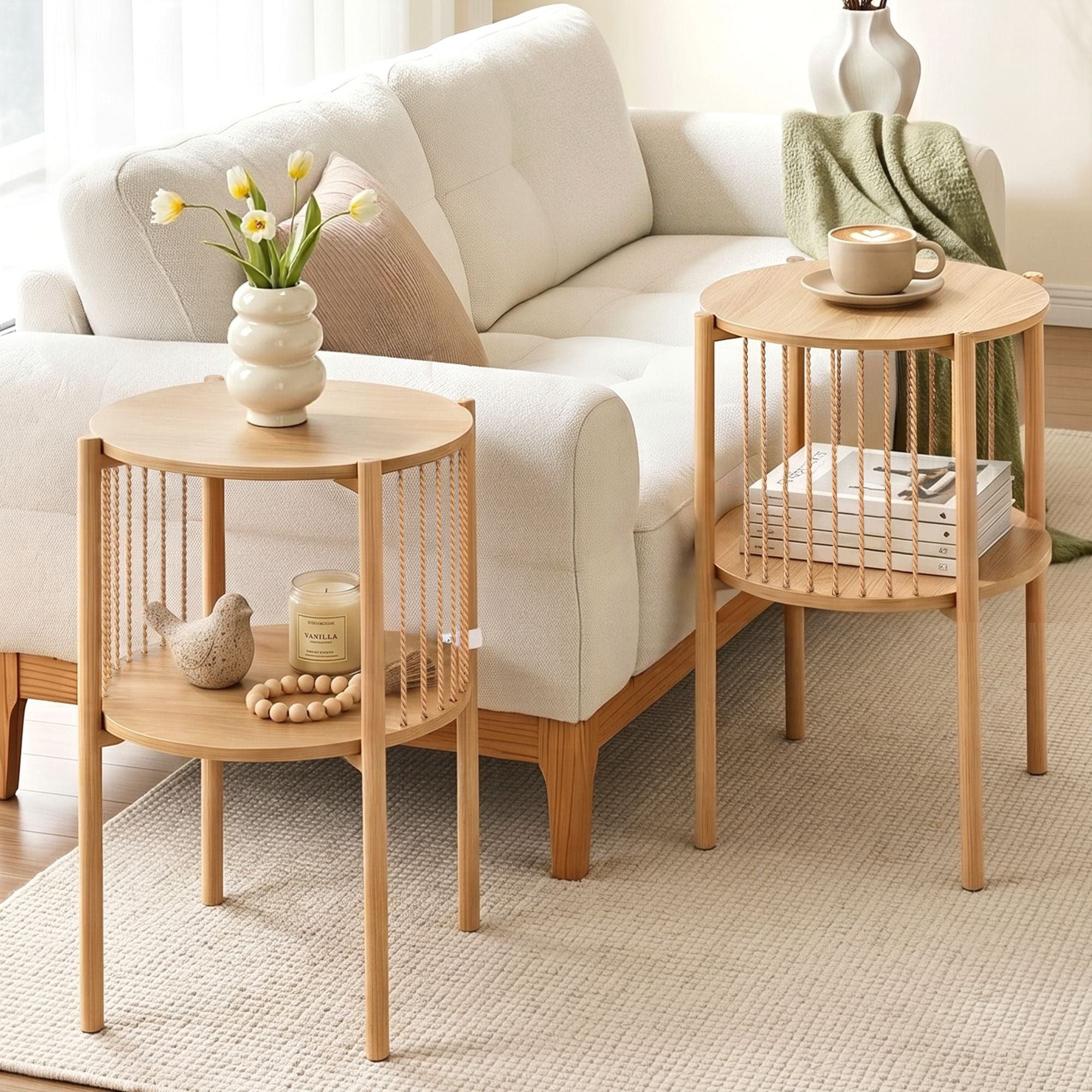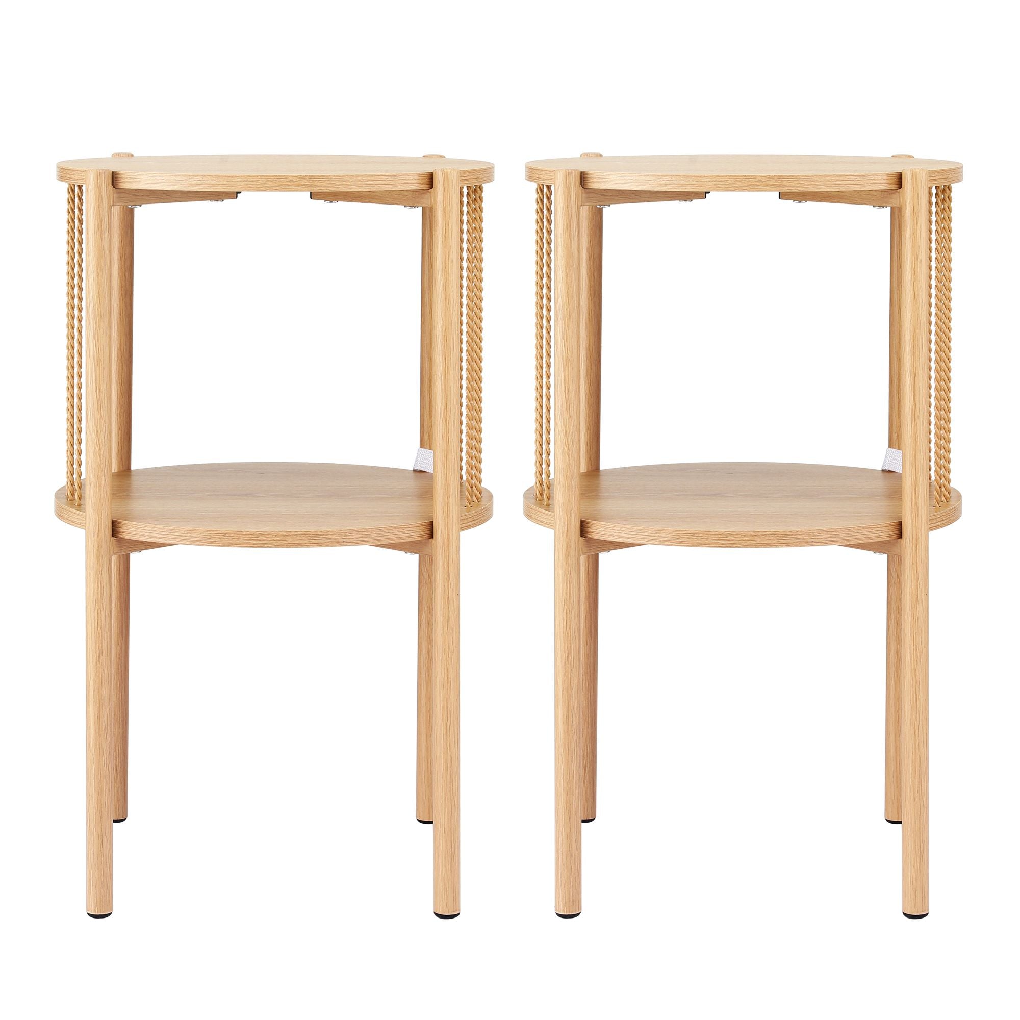Enhance your home with the Artiss Set of 2 End Tables. Combining rustic charm with modern functionality, these tables feature unique straw-rope-shaped metal bars and a natural wood-look finish. The 2-tier design maximizes vertical space, providing ample room for decor and storage. Measuring 39cm x 65cm, they fit perfectly in tight corners or beside your sofa and bed. Sturdy enough to hold 20kg on top, these Boho-inspired pieces are durable, easy to clean, and simple to assemble. Perfect for creating a cozy, organized living space.