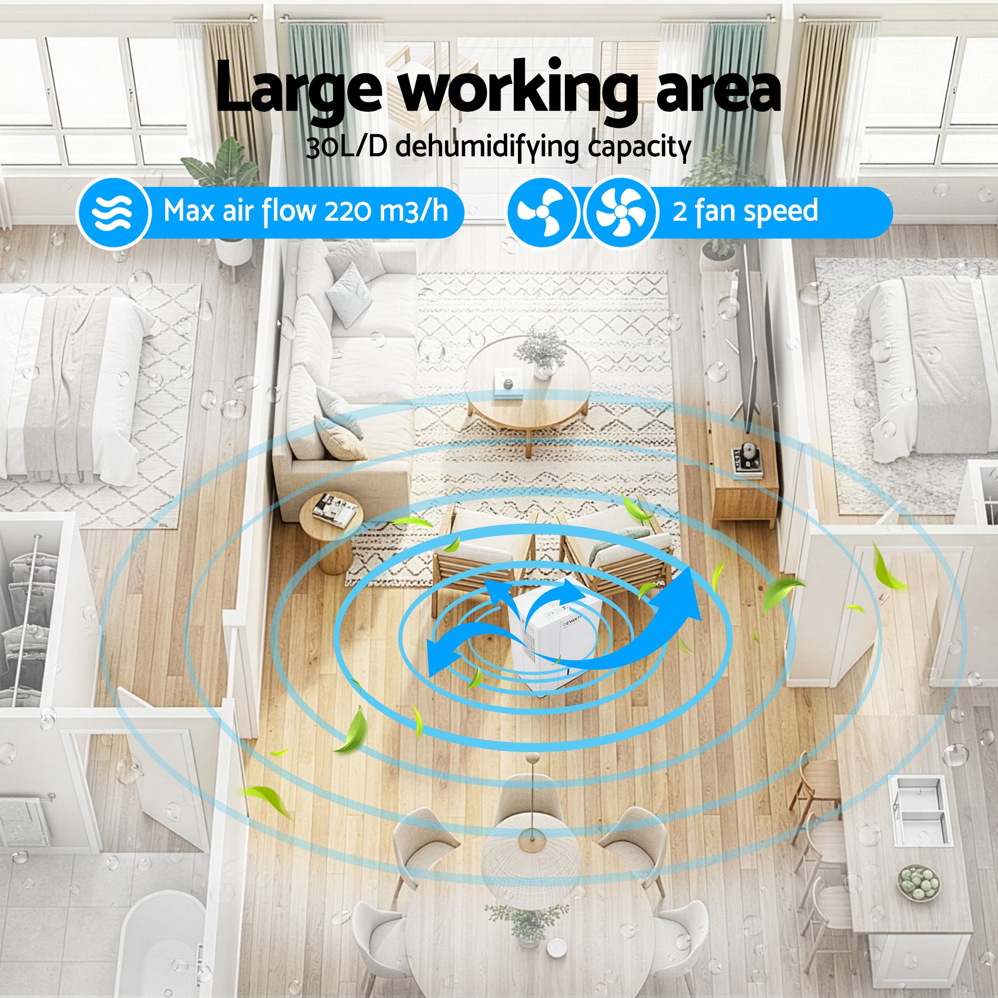 Devanti 30L Dehumidifier & Air Dryer Create a healthy home with this 30L/day moisture absorber. Perfect for medium-large rooms, it features 4 modes including 'Strong' for fast laundry drying and 'Ventilation' for airflow. The stylish hidden front display monitors humidity in real-time. Equipped with a 4.7L water tank and a 101cm hose for continuous drainage. Enjoy whisper-quiet Sleep Mode (โค47dB), 24h timer, and power failure memory. Portable on easy-roll casters, this R290 eco-friendly unit is your solution to mould and damp.