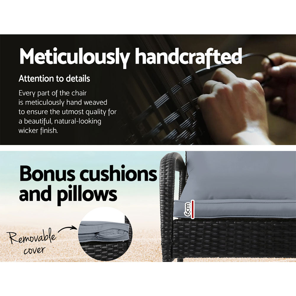 Gently sway to the better moments of life with the 2PC Gardeon Outdoor Rocking Set. Our high-quality resin rattan chair and tempered glass wicker side table is made weather-resistant and UV-resistant to stand up to the test of time and climate with their powder-coated steel frame and meticulous workmanship. Better still, the set comes with matching thick cushions and pillows with removable covers to let you rock your leisure time away with utmost comfort. Not least, the table also features a wicker border finish with a tempered glass top for safety and durability. So ease your mind, body and soul with the Gardeon Outdoor Rocking Set. Perfect for both outdoors and indoors use.