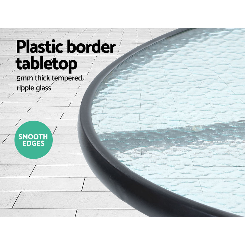 Enjoy the pleasant outdoors or have a nice chat with friends over a cuppa with our Gardeon 3PC Outdoor Bistro Set. With its chic and trendy profile, the set comes with a glass-top table and two wicker chairs. The elegant table is stunning in looks and equally as functional. The thick steel frame makes it durable and the 5mm thick tempered ripple glass does not only look stylish, it is easy to clean. Plus, there is a built-in hole for your parasol for you to relax outdoors for as long as you like during the hot summers without the fear of getting sunburnt. The chair is finished in meticulously weaved UV-resistant and weather-resistant PE wicker with a strong and sturdy steel frame construction. The exotic design, spacious seating and 5cm thick high-density foam cushions ensure comfort and style are always in place. Best of all, the removable and washable seat cushion cover makes cleaning up hassle-free. Together, the set is designed to please as well as stand up to the weather elements and the non-slip feet make the set suitable for use in even the most slippery of situations. With so much going for it, the bistro set certainly deserves its coveted space in your lovely backyard, deck or patio. Or even indoors for a unique presence.