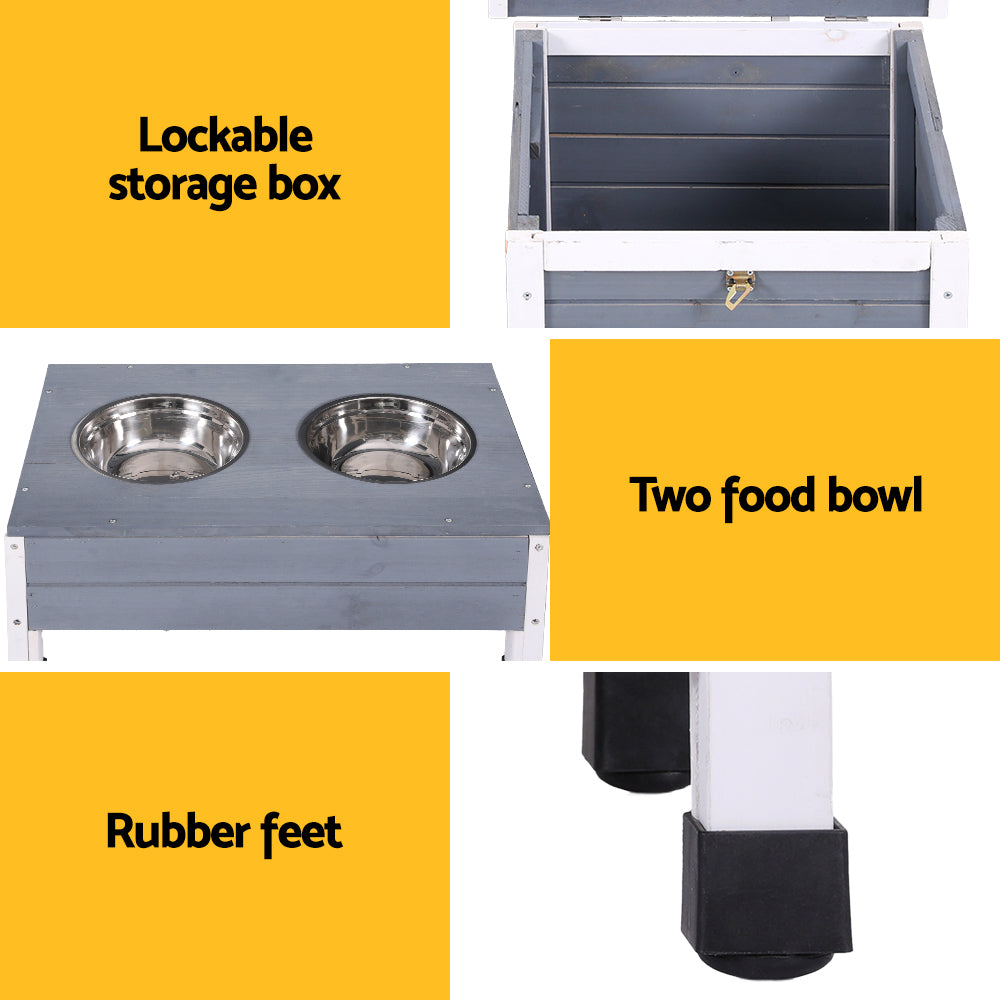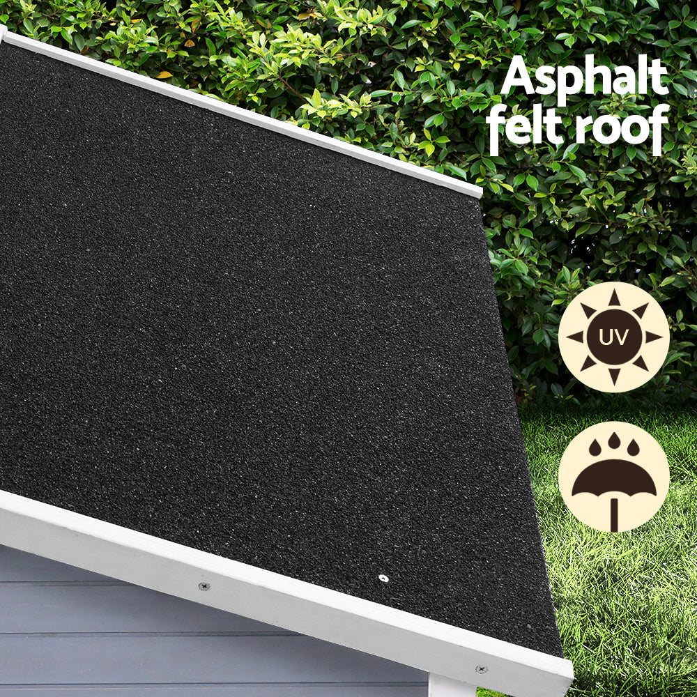 Provide your furry friend with a comfortable and secure haven indoors or outdoors with this all-weather dog kennel. Made with durable, heavy-duty construction, it can withstand the elements thanks to its weatherproof design and UV-resistant asphalt roof. Two food bowls are conveniently included, and a lockable storage box offers a secure place for leashes, treats, or toys. An elevated base keeps your pet dry and comfortable, while rubber feet protect your floors and prevent the kennel from sliding. Easy entry and exit allow your dog to come and go as they please, and the smooth surfaces make cleaning a breeze. This kennel is also easy to install, so you can create a cozy space for your pet in no time.