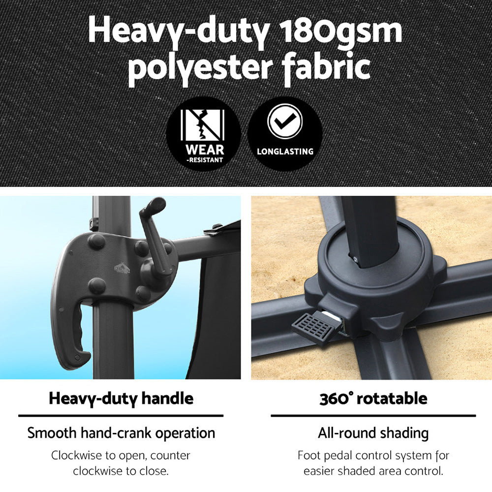 Soak up the sun, while staying cool under our Instahut side post umbrella. Its robust aluminium frame supports an octagonal UV50+ canopy, ideal for the peak of summer. Made of water-resistant and wear-resistant polyester, it stands up to all sunny adventures. A water-fillable, portable base ensures beach-to-backyard versatility, while the washable canopy ensures freshness. Sunshine and shade, harmoniously blended for your summer escapades. Note: Umbrella base not included.