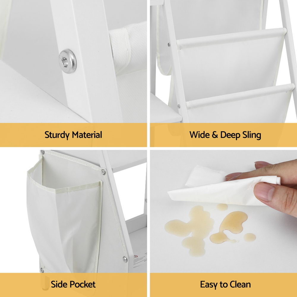 Crafted from water-resistant PB melamine with a sturdy metal frame, this white bookshelf wipes clean easily and withstands daily use. The added fabric pocket offers extra storage for small items. Measuring 75H οΏ½οΏ½ 30W οΏ½οΏ½ 83D cm and suitable for ages 3+, it helps develop tidying habits while fitting perfectly in bedrooms or playrooms. Simple assembly required with all hardware included.